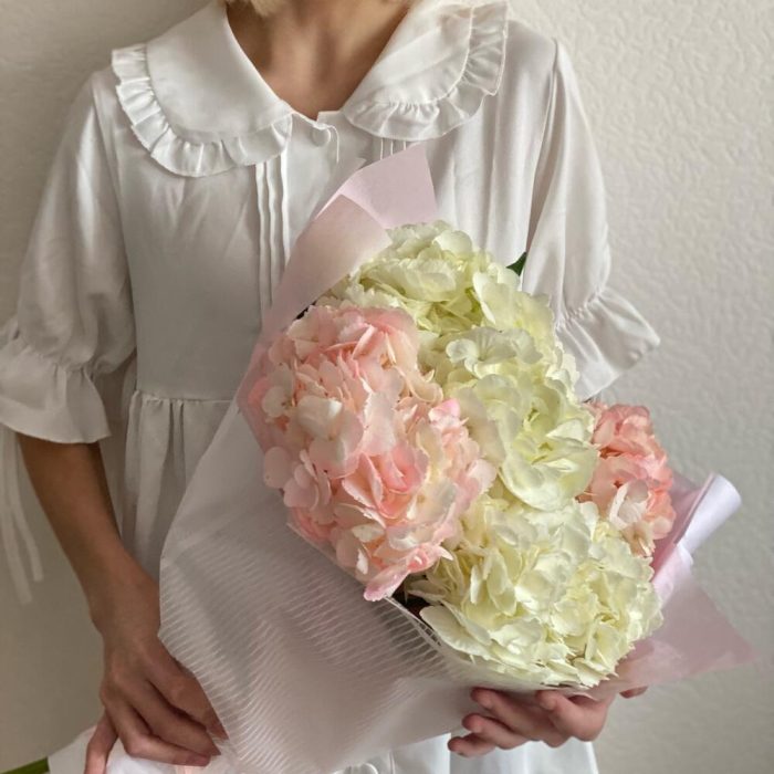 Лента атласная – 1 шт.Упаковка дизайнерская – 4 шт.Гортензия микс – 5 шт.