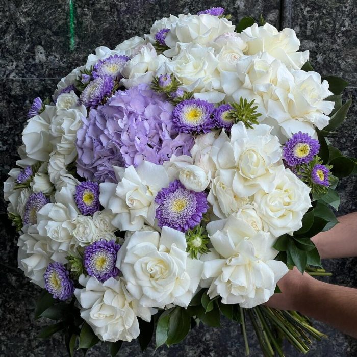 Гортензия сиреневая – 1 шт. Астра кустовая – 9 шт. розы – 21 шт. розы кустовые пионовидные – 7 шт. Рускус – 25 шт. Аспидистра – 6 шт.