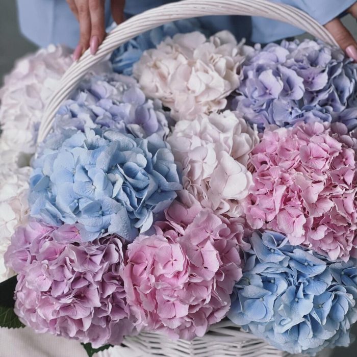Корзина плетеная – 1 шт.Гортензия – 19 шт.Оазис флористический – 3 шт.