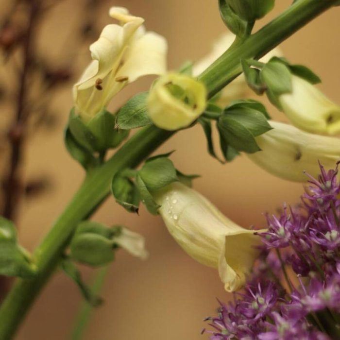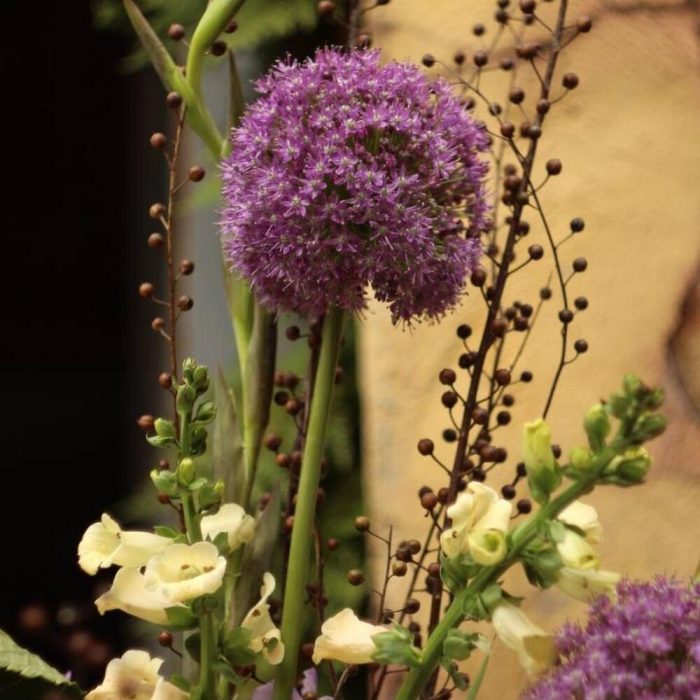 Гортензия – 5 шт.Аллиум – 5 шт.Гладиолус – 7 шт.Наперстянка – 5 шт.Лен – 3 шт.Эвкалипт – 9 шт.Лента – 1 шт.