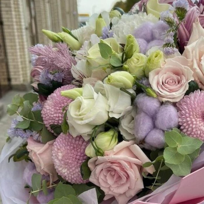 момоко – 7 шт.Роза – 7 шт.Гвоздика – 7 шт.Хлопок – 5 шт.Альстромерия – 5 шт.Эустома – 3 шт.Тишью – 2 шт.Фоамиран – 4 шт.