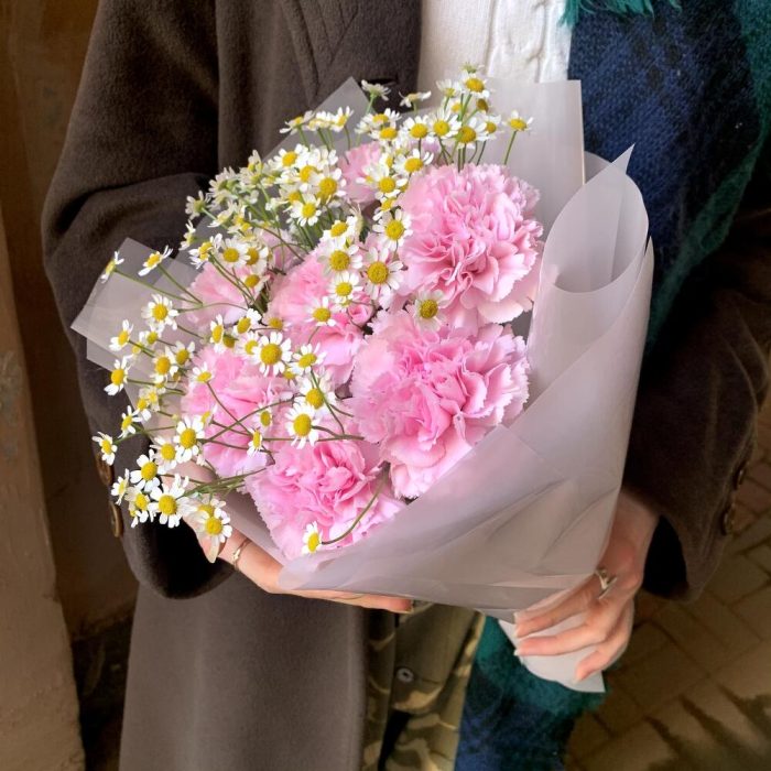 Гвоздика розовая – 7 шт.Матрикария – 4 шт.авторска упаковка – 1 шт.