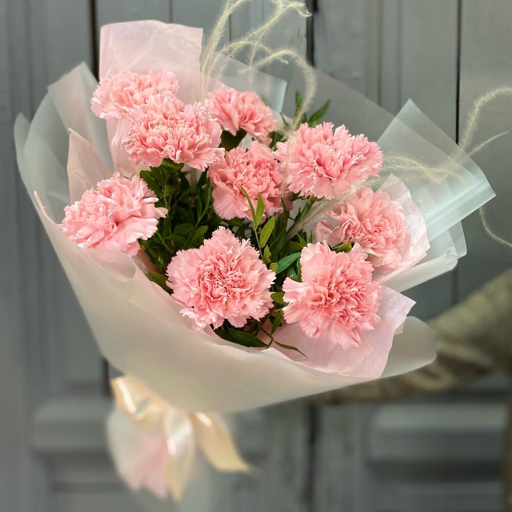 Диантус сортовой – 9 шт.Фисташка – 1 шт.Ковыль – 2 шт.Упаковка дизайнерская – 2 шт.Лента атласная – 1 шт.