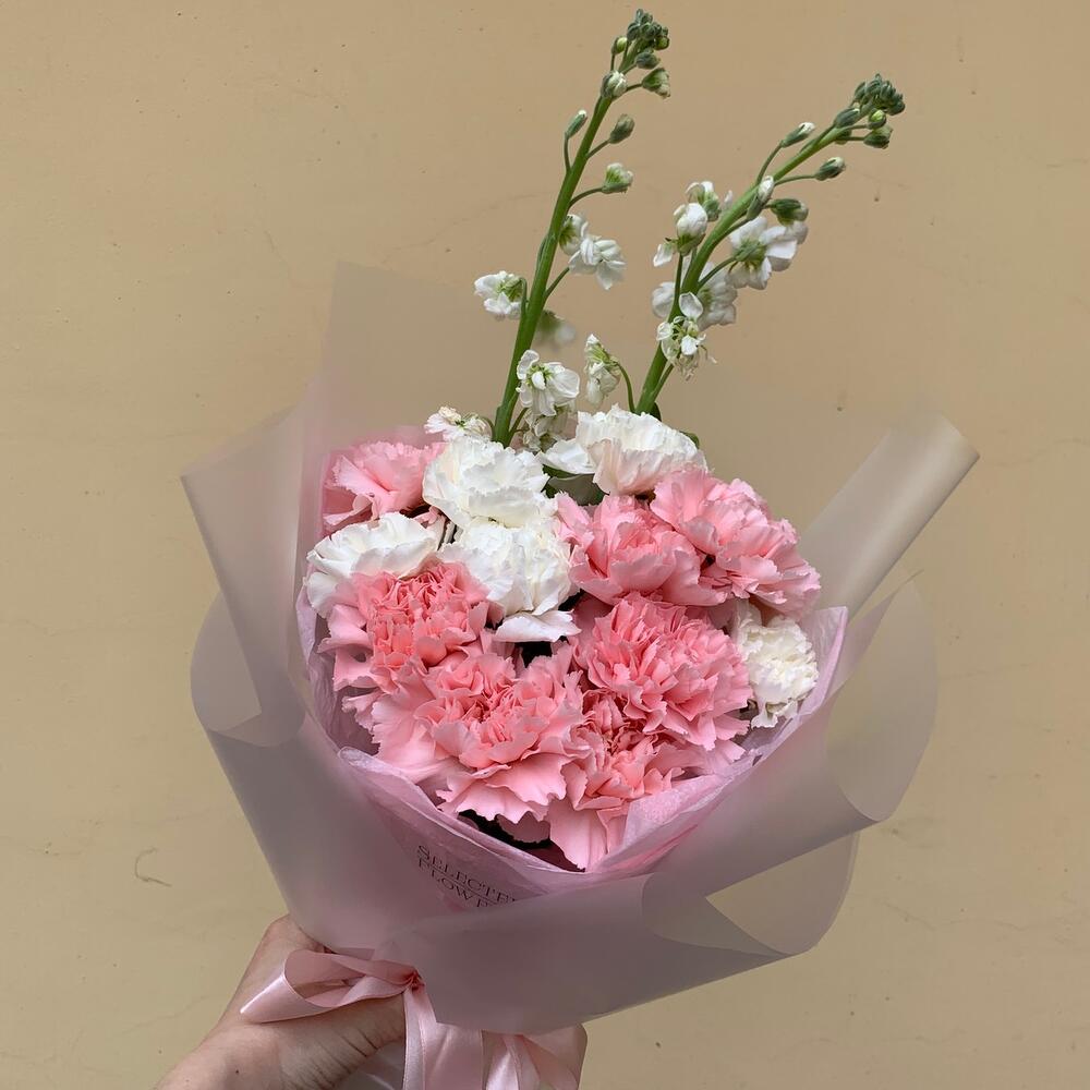 Гвоздика – 13 шт.Маттиола – 2 шт.Дизайнерская упаковка – 1 шт.