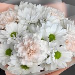 Лента атласная – 1 шт.Диантус – 4 шт.Хризантема кустовая ромашковая белая – 3 шт.упаковка флористическая – 1 шт.