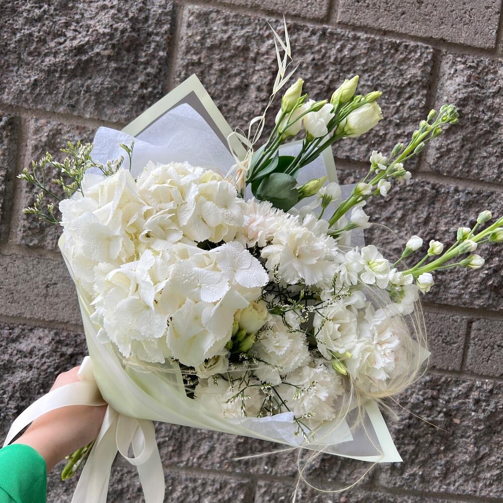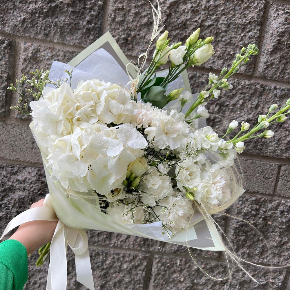 Гортензия – 1 шт.Диантус – 6 шт.Эустома – 2 шт.Лимониум – 1 шт.Ковыль – 2 шт.Маттиола – 2 шт.Упаковка дизайнерская – 4 шт.Лента атласная – 2 шт.