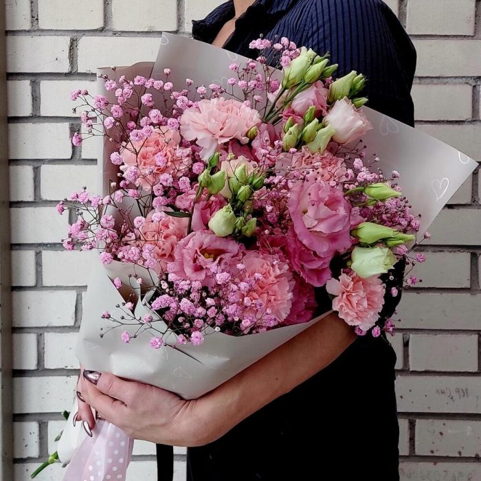 Лизиантус розовый – 3 шт.гипсофила радужная – 2 шт.Диантус – 9 шт.Упаковка дизайнерская – 3 шт.Лента атласная – 1 шт.