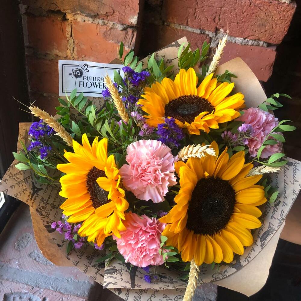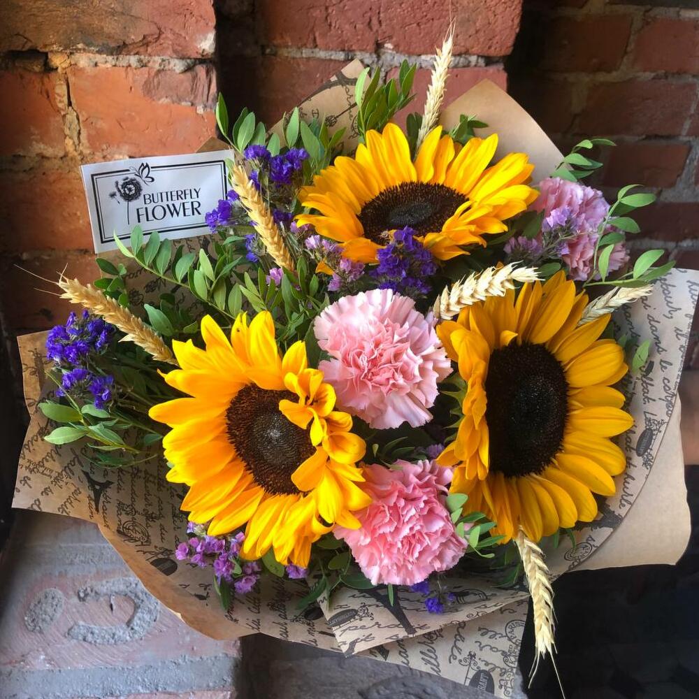 Букет с подсолнухами, гвоздикой и статицей “Яркие краски”