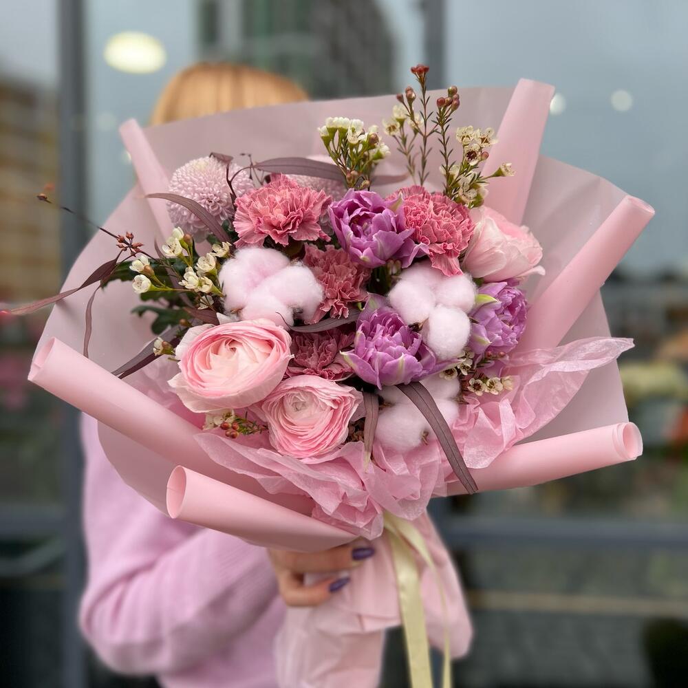 Ранункулюс – 3 шт.Хризантема одноголовая – 2 шт.Диантус – 4 шт.Тюльпан пионовидный – 3 шт.Хлопок (сухоцвет) – 3 шт.Хамелациум – 2 шт.Эвкалипт – 1 шт.Упаковка дизайнерская – 2 шт.Лента атласная – 1 шт.