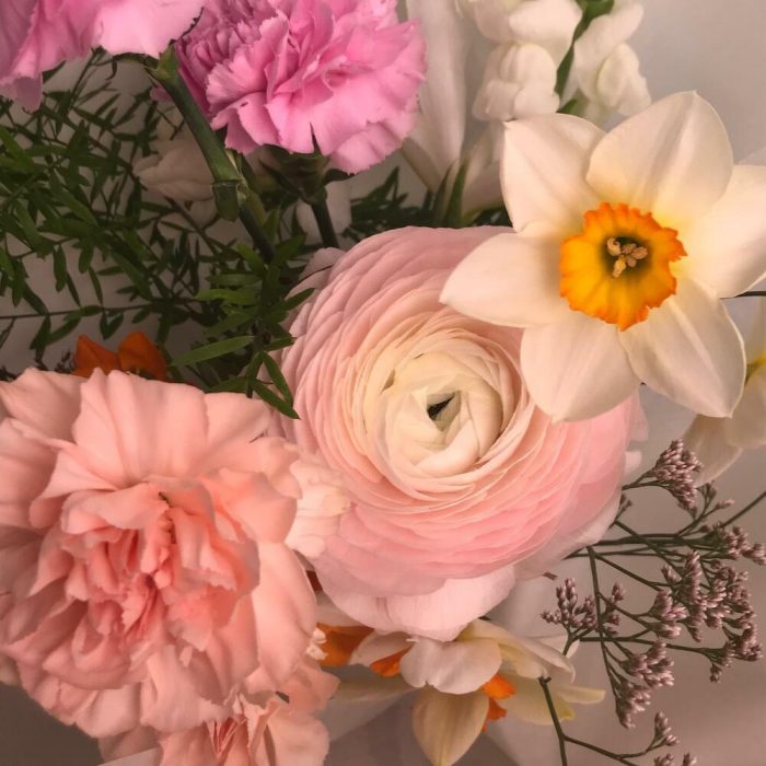 Ранункулюс – 1 шт.Ирис – 1 шт.Нарцисс – 4 шт.Гвоздика – 5 шт.Орнитогалум – 1 шт.антиринум – 1 шт.аспарангус – 1 шт.