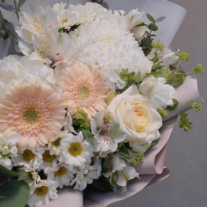 Роза – 1 шт.Гермини – 2 шт.Альстромерия – 3 шт.Сантини – 2 шт.Маттиола белая – 2 шт.Буплерум – 2 шт.Лизиантус – 1 шт.Диантус – 3 шт.ковыль (пучок) – 3 шт.Эвкалипт Baby Blue – 3 шт.Рускус – 12 шт.Упаковка дизайнерская – 2 шт.Лента атласная – 1 шт.антонов – 1 шт.