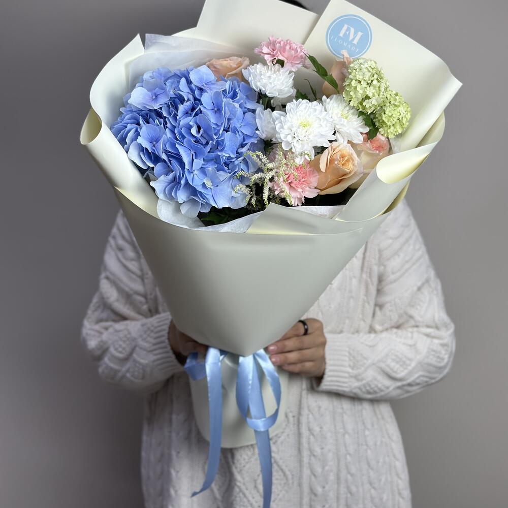 Садовая композиция с гортензиями, пионами, пионвоидными розами и колокольчиками