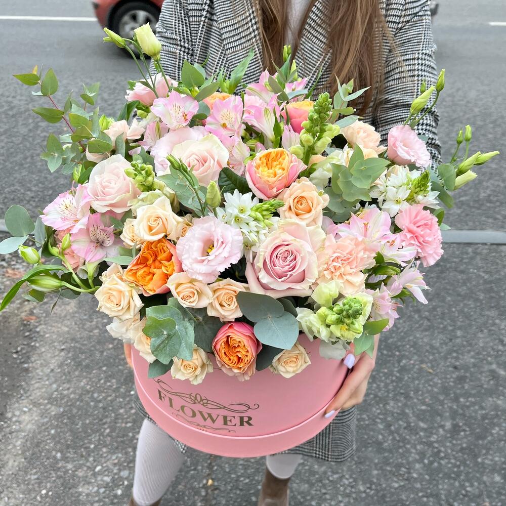 Цветы в коробке с нежными розами, тюльпанами и антириниуми