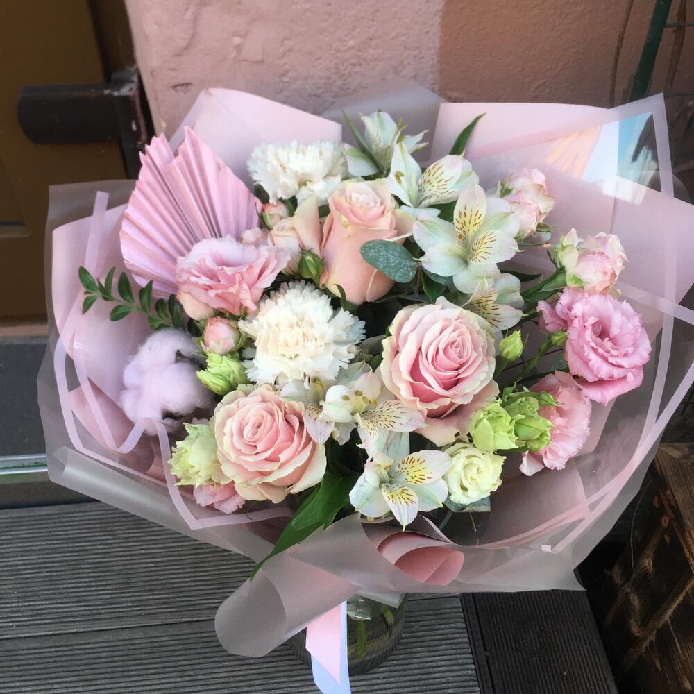 розовые розыз – 3 шт.Эустома – 2 шт.Диантус – 2 шт.Альстромерия – 2 шт.Кустовая роза – 2 шт.Хлопок – 1 шт.Сухоцветы – 1 шт.Упаковка дизайнерская – 1 шт.