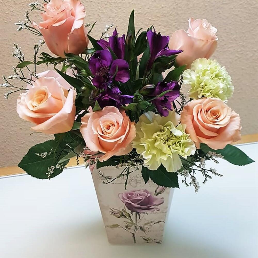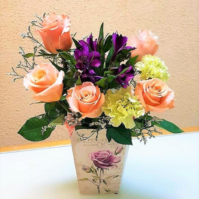 Роза Эквадор – 5 шт.Альстромерия – 1 шт.Лимониум – 1 шт.Гвоздика – 2 шт.Коробка – 1 шт.Бумага – 1 шт.
