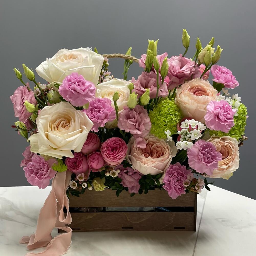 Альстромерия – 4 шт.Ваксфлауэр – 2 шт.Вибурнум – 1 шт.Лизиантус – 3 шт.Роза кустовая пионовидная – 3 шт.гвоздика сортовая (диантус) – 9 шт.Лента атласная – 1 шт.Аллиум – 4 шт.Ящик деревянный – 1 шт.Оазис флористический – 1 шт.роза пионовидная премиум сорт – 5 шт.стаффаж – 5 шт.Лента тканевая – 1 шт.