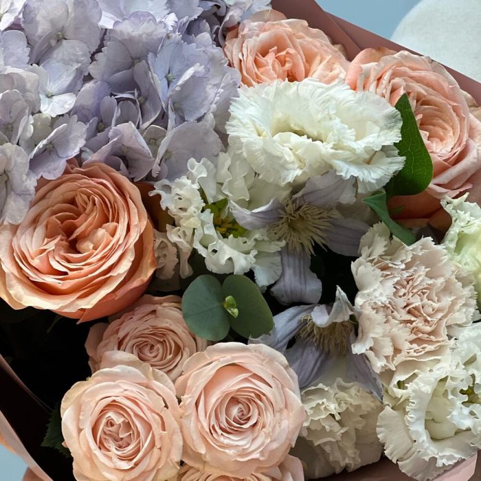 Гортензия – 1 шт.Эустома – 1 шт.Диантус – 1 шт.Клематис – 1 шт.Пленка матовая – 1 шт.Бомбастик – 1 шт.кахала – 3 шт.эвкалипт 50 – 3 шт.