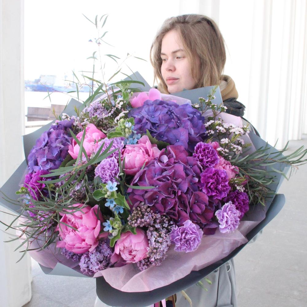 Лиловый поцелуй – Гортензии, пионы и восковой мирт