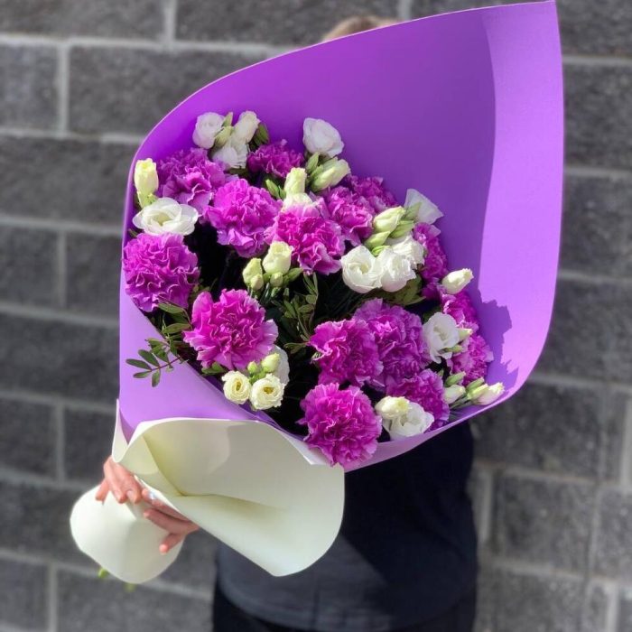 Диантус – 15 шт.Лизиантус – 5 шт.Фисташка – 3 шт.Упаковка дизайнерская – 1 шт.Лента атласная – 1 шт.
