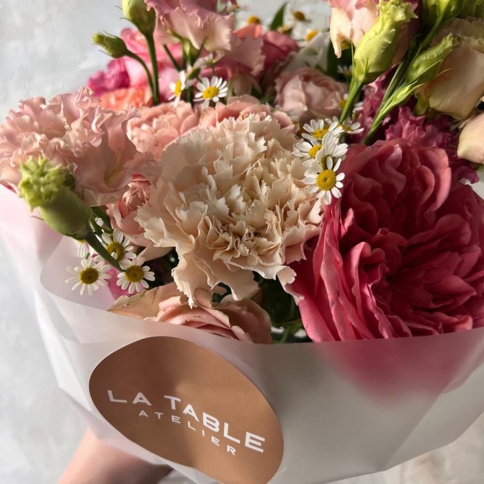 Альстромерия – 2 шт.Лизиантус – 1 шт.Роза кустовая – 1 шт.Роза – 3 шт.Гвоздика – 3 шт.Матрикария – 2 шт.Упаковка дизайнерская – 1 шт.