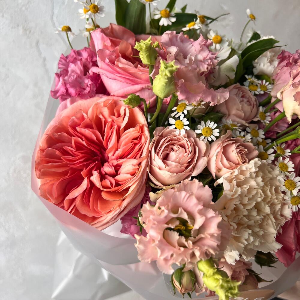Милый букет с пионовидной розой, ромашками и лизиантусом