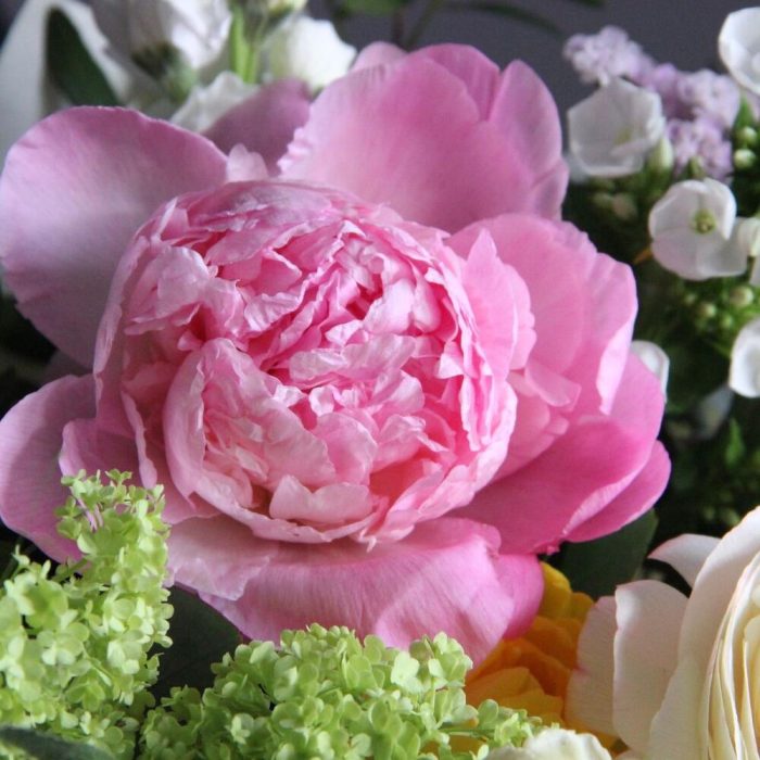 Садовый букет с пионом, сиренью, маттиолой, тюльпанами, флоксами, ранункулюсом, львиным зевом, паникумом и диантусами.
