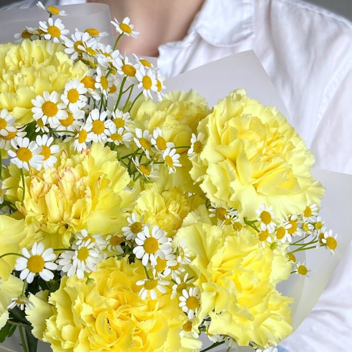 Лента – 1 шт.Матрикария – 4 шт.Дизайнерская упаковка – 1 шт.солнечный диантус – 9 шт.