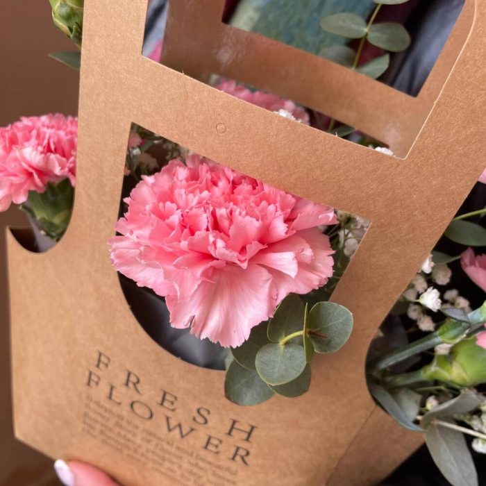 Гипсофила – 1 шт.Эвкалипт – 1 шт.Гвоздика розовая – 7 шт.Коробка – 1 шт.
