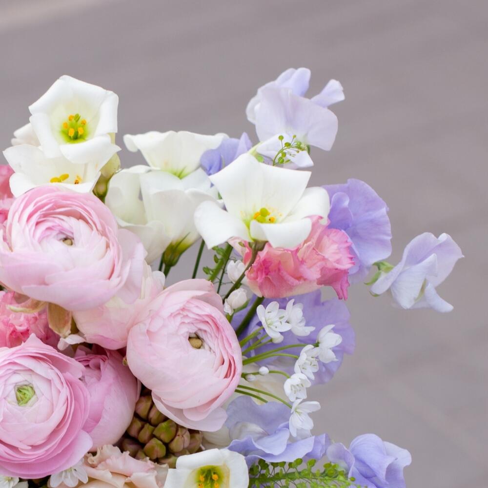 Нежный букет с латирусом и ранункулюсами в корейском стиле