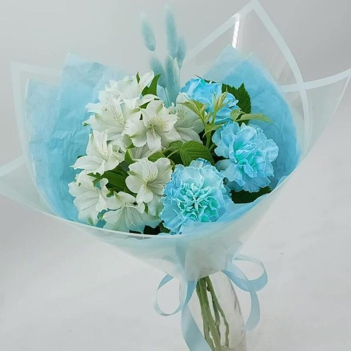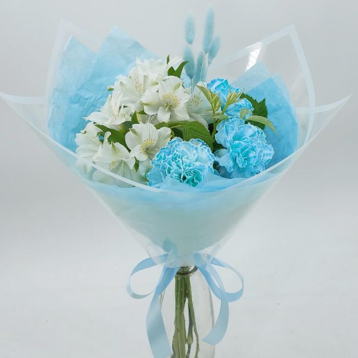 Упаковка дизайнерская – 1 шт.Лагурус – 5 шт.Средство для продления жизни цветов – 1 шт.рускус зелень ветка – 2 шт.альстромерия премиум – 2 шт.гвоздика молли голубая – 3 шт.