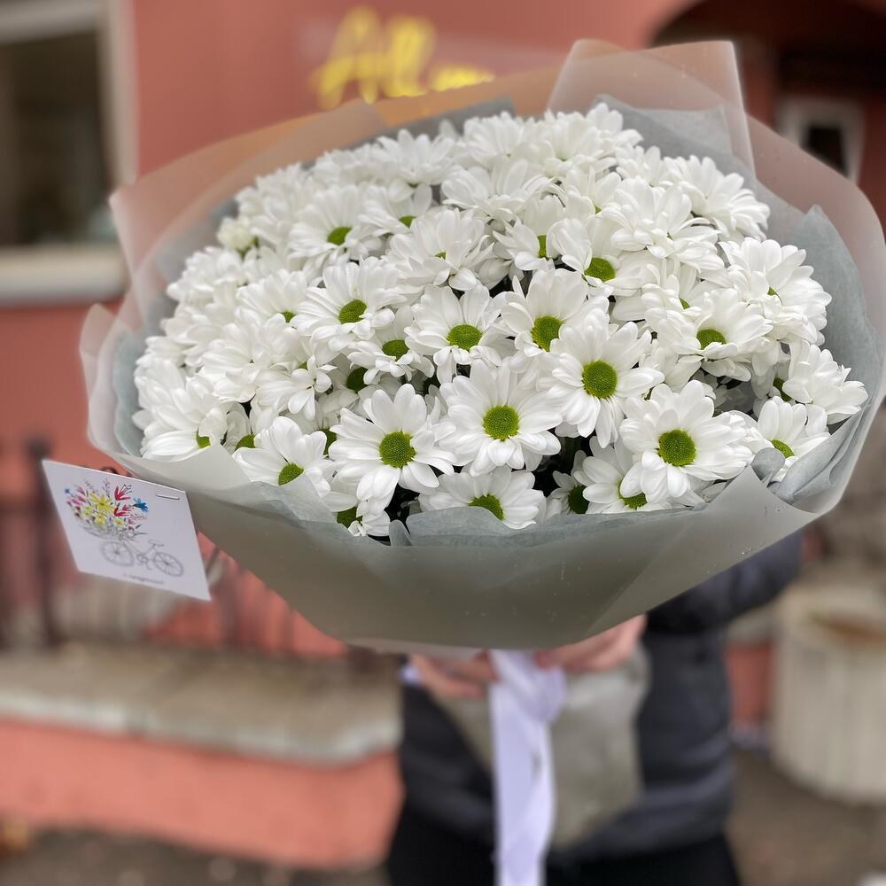 Букет из 11 веток ромашковых хризантем с оформлением , количество ромашек в букете может достигать 101 штуки .