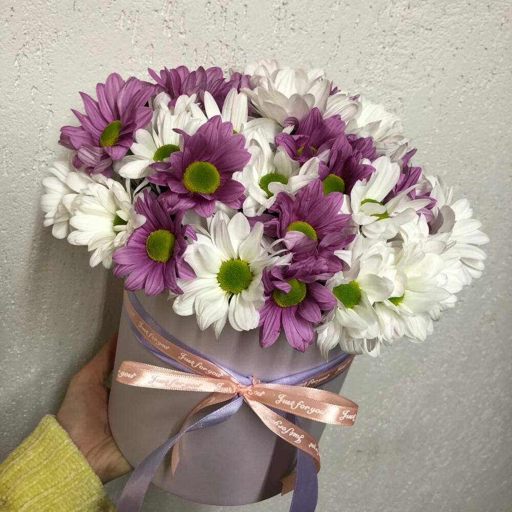 Хризантема кустовая розовая – 2 шт.Хризантема кустовая белая – 3 шт.Шляпная коробка – 1 шт.Лента атласная – 1 шт.Оазис – 1 шт.