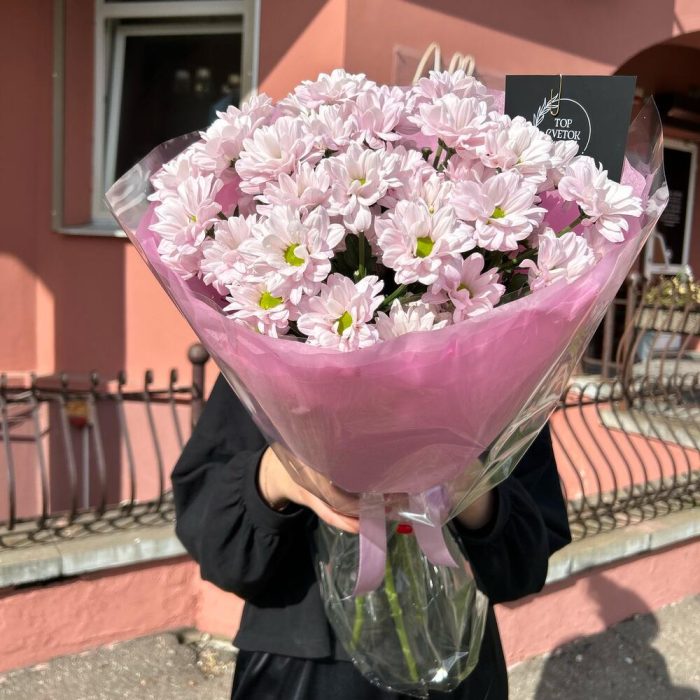 Тишью – 1 шт. Атласная лента – 1 шт. Целлофан – 1 шт. Ромашковая хризантема – 5 шт.