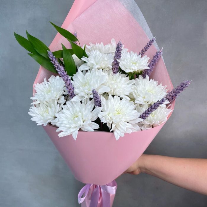 «Лавандовое созвездие» Букет из розы, гвоздики, статица и хлопка