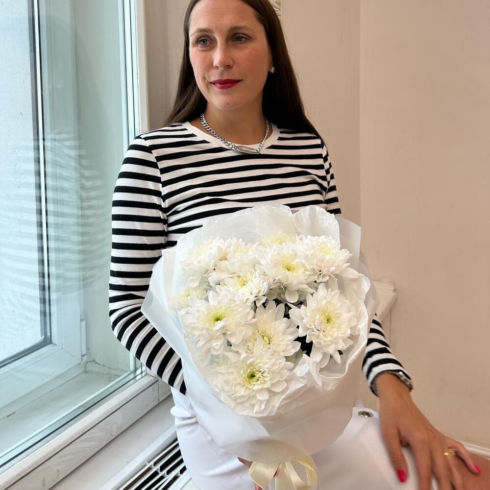 Хризантема кустовая – 3 шт.Лента атласная – 1 шт.Дизайнерская упаковка – 1 шт.