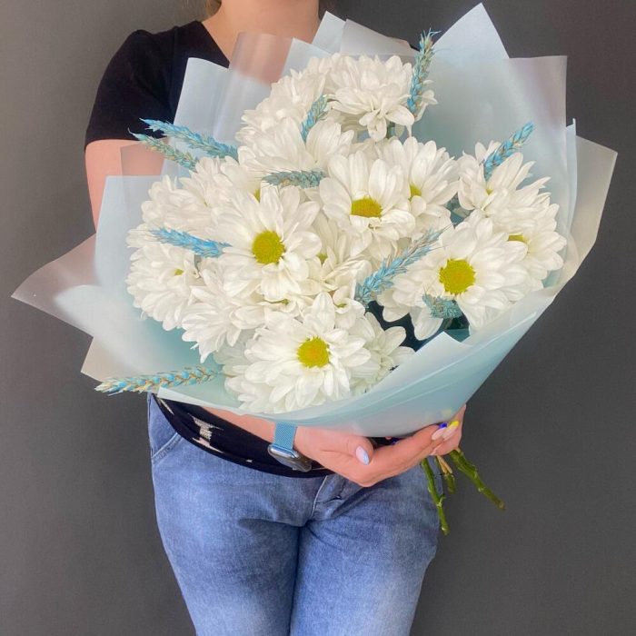 Лента атласная – 1 шт.Сухоцветы – 11 шт.Хризантема Ромашковая – 5 шт.Пленка матовая – 3 шт.тишью голубое – 2 шт.