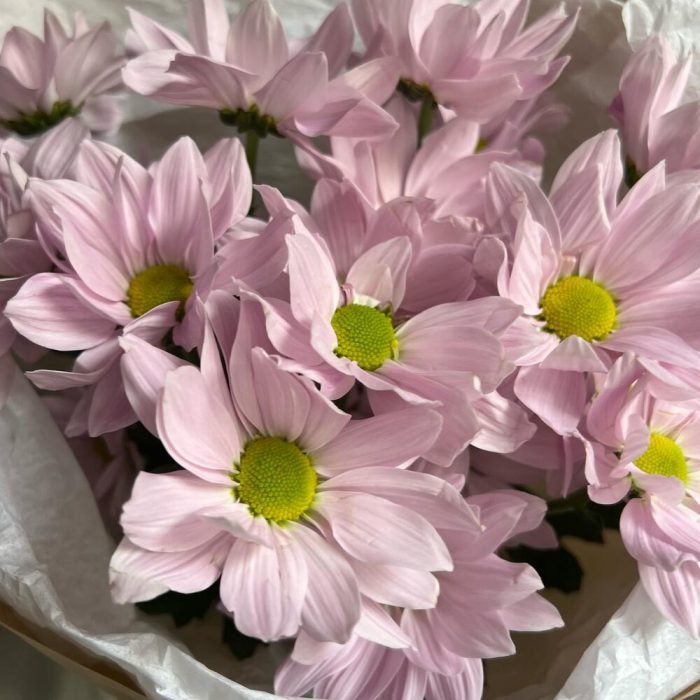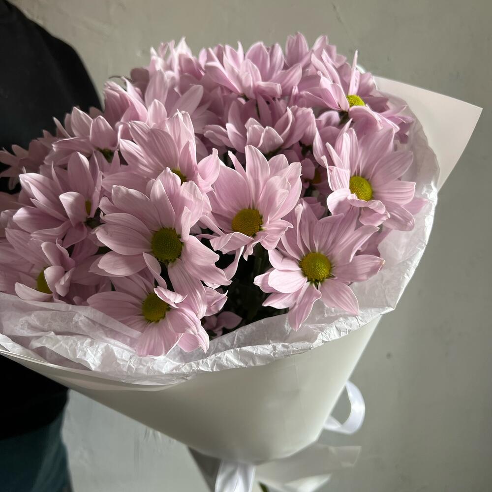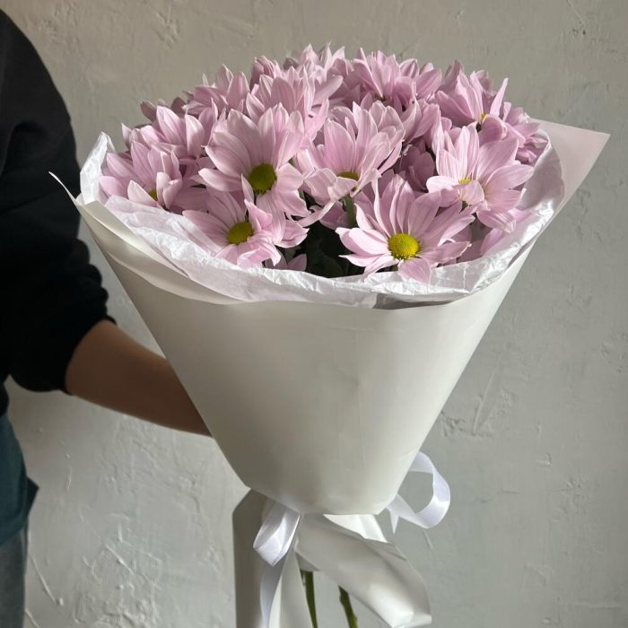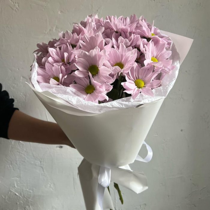 Кустовая хризантема – 5 шт.Лента атласная – 2 шт.Упаковка дизайнерская – 2 шт.