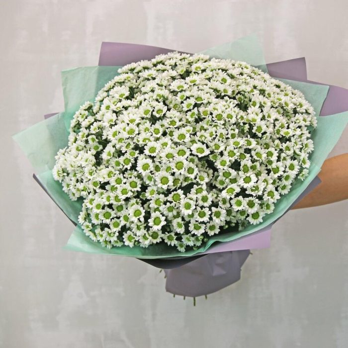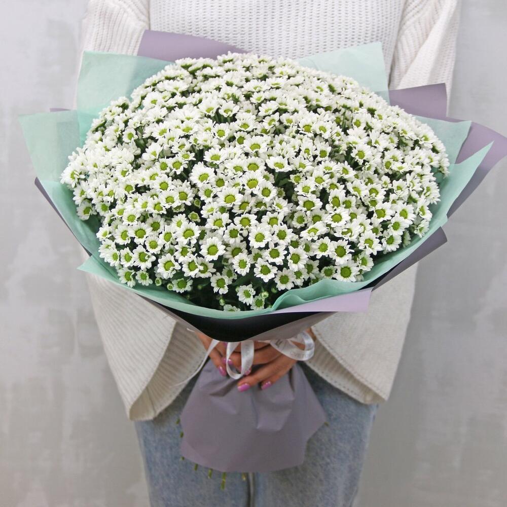 Букет из 51 белой кустовой хризантемы Сантини в стильной упаковке