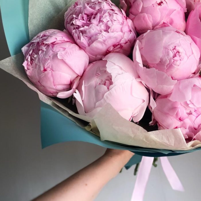 Букет из 9ти пионов в бирюзовой упаковке
