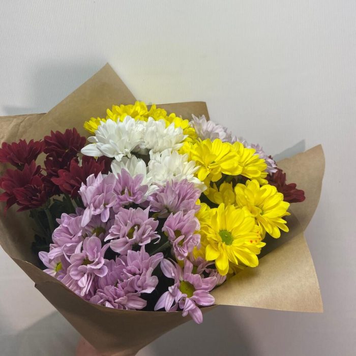Хризантема кустовая – 7 шт.Упаковка крафт – 1 шт.Лента – 1 шт.