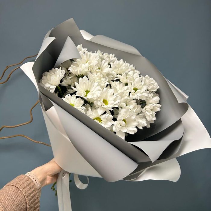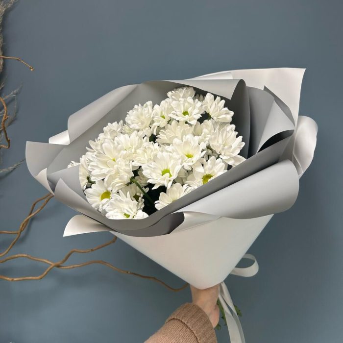 Хризантема кустовая – 5 шт.Упаковка – 2 шт.Лента атласная – 1 шт.