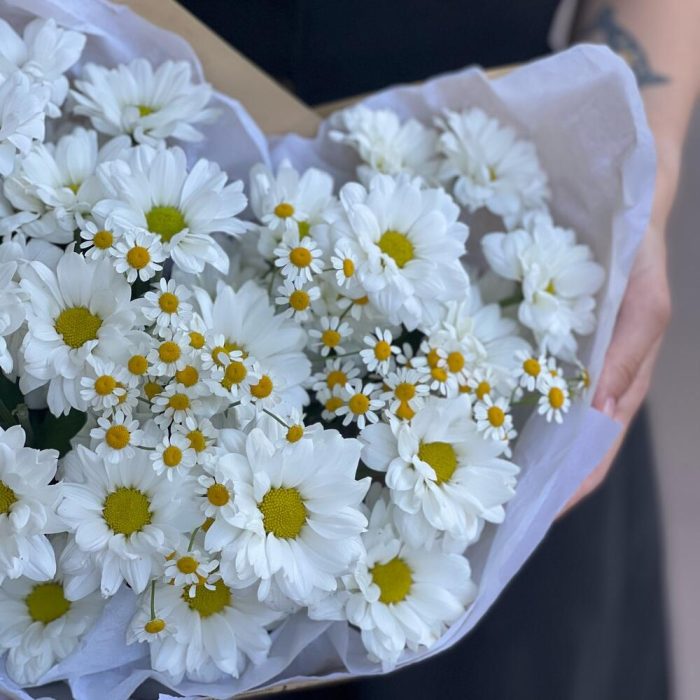 Хризантема кустовая – 5 шт.Ромашка кустовая – 2 шт.Сухоцветы – 3 шт.Упаковка дизайнерская – 1 шт.Кризал (подкормка) – 1 шт.