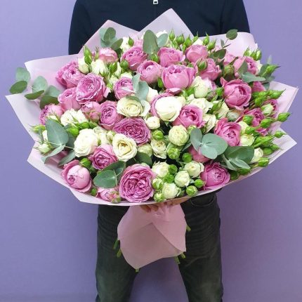 Евро-Букет из Гортензии ,Пионовидных Роз,Лизиантсуов и Белых роз + открытка ручной работы в подарок