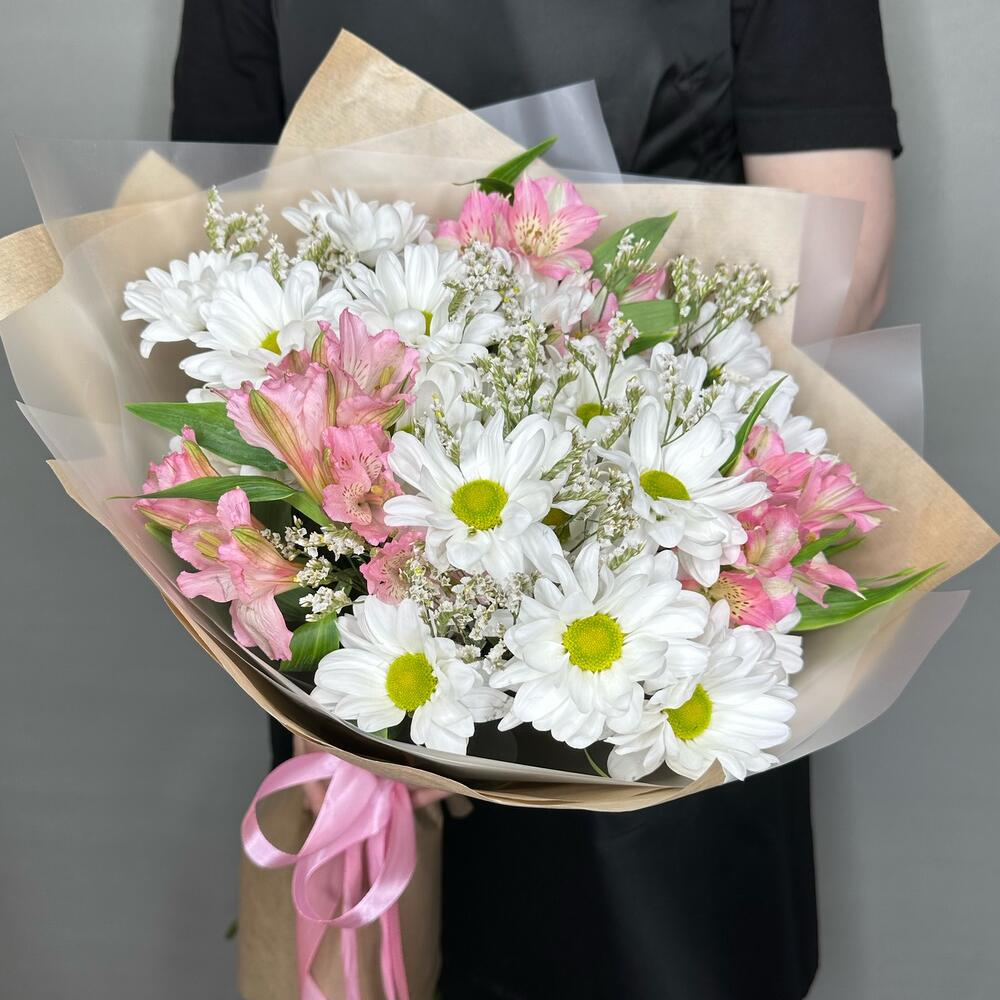 Хризантема кустовая ромашковая – 4 шт.Альстромерия – 3 шт.Лимониум – 1 шт.Упаковка дизайнерская – 1 шт.Лента атласная – 1 шт.