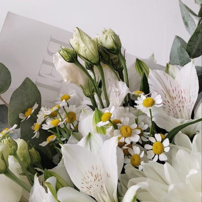 Альстромерия – 2 шт.Эвкалипт – 4 шт.Лента атласная – 3 шт.Ромашка кустовая – 3 шт.Хризантема одноголовая – 1 шт.Упаковка дизайнерская – 3 шт.эустома белая – 2 шт.