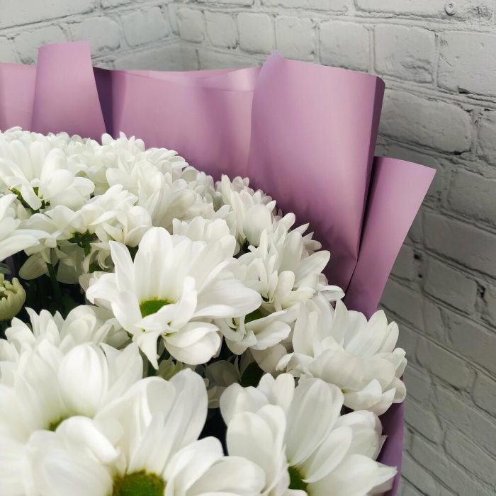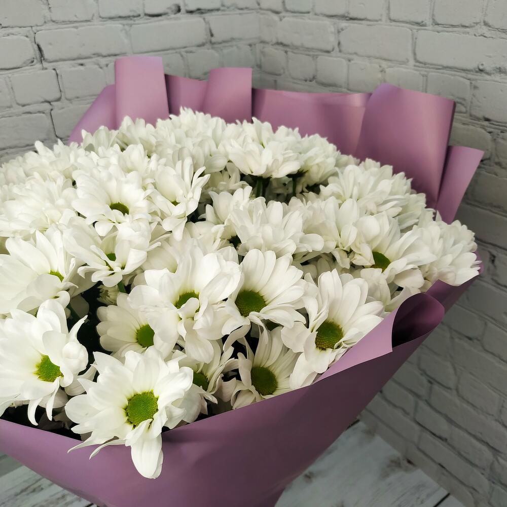 Прекрасный букет из белых хризантем, станет идеальным подарком для самых любимых и близких!Памятка для букета:1. Чистая вода раз в сутки.2. Стебли подрезаем на 0,5см при каждой смене воды.3. Ставим в прохладное место, но не у окна.4. Чтобы вода оставалась свежей, не допускайте попадания листьев и лепестков в воду.Друзья, обратите внимание, что цвет упаковки может быть другим, в зависимости от наличия на складе.