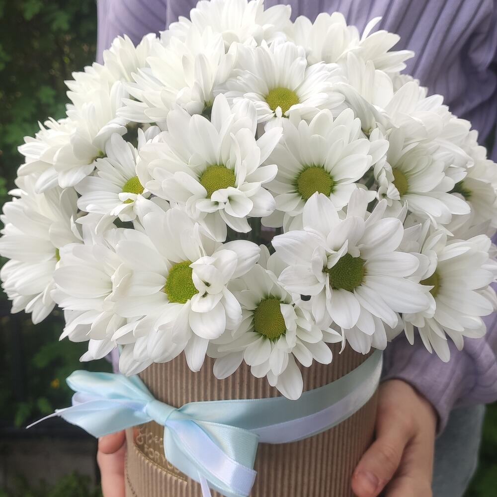 Хризантема кустовая ромашковая – 8 шт.шляпная коробка крафт – 1 шт.Губка флористическая – 1 шт.Лента атласная – 2 шт.