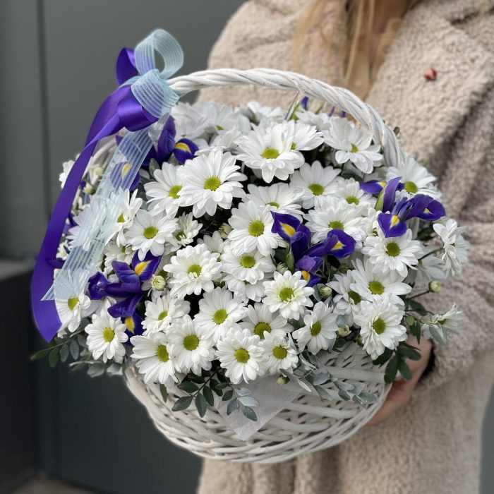 Корзина – 1 шт. Писташ – 6 шт. Хризантема – 11 шт. Оазис – 2 шт. Оформление – 1 шт. ирисы – 9 шт.