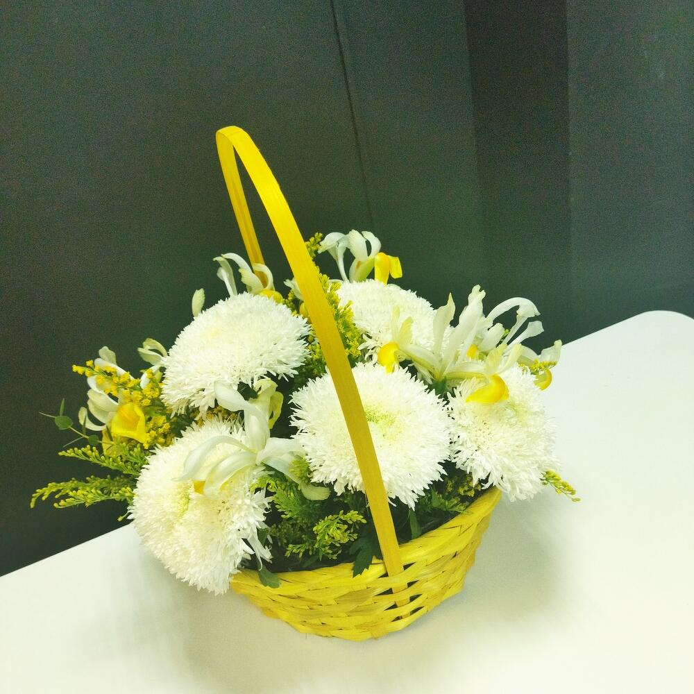 Корзина с большими белыми хризантемами