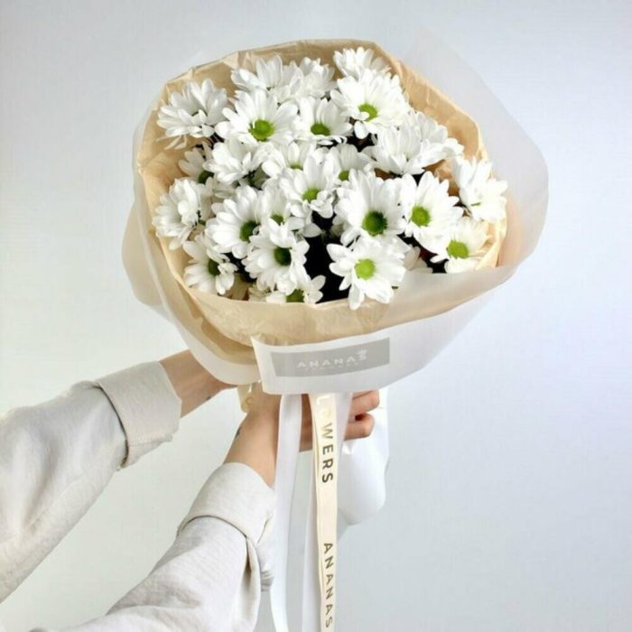 Монобукет из белоснежных кустовых ромашковых хризантем в дизайнерской упаковке